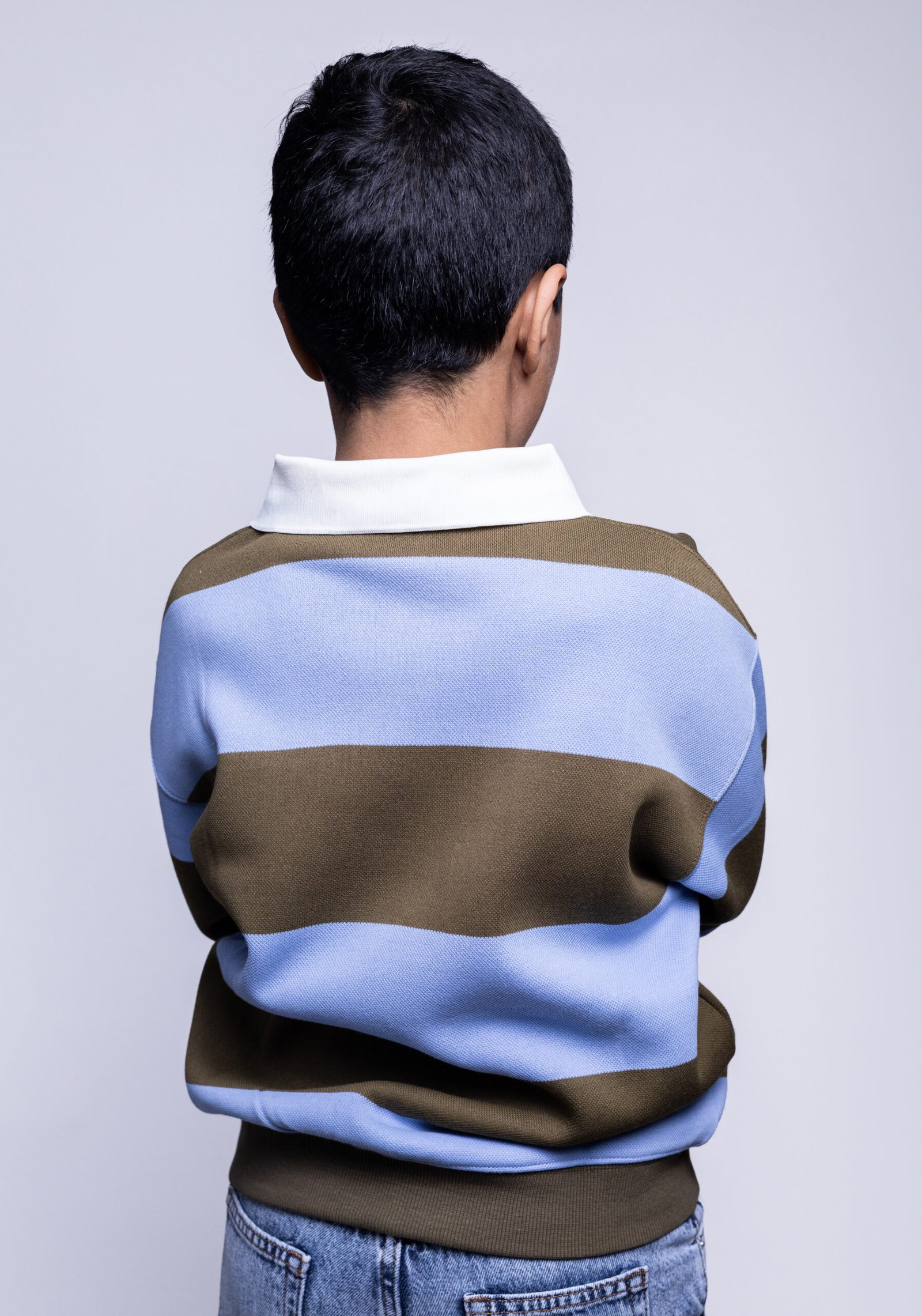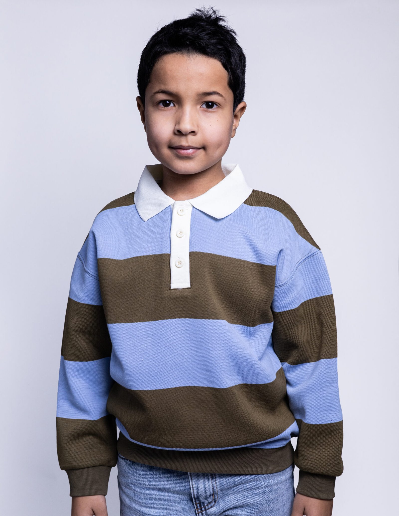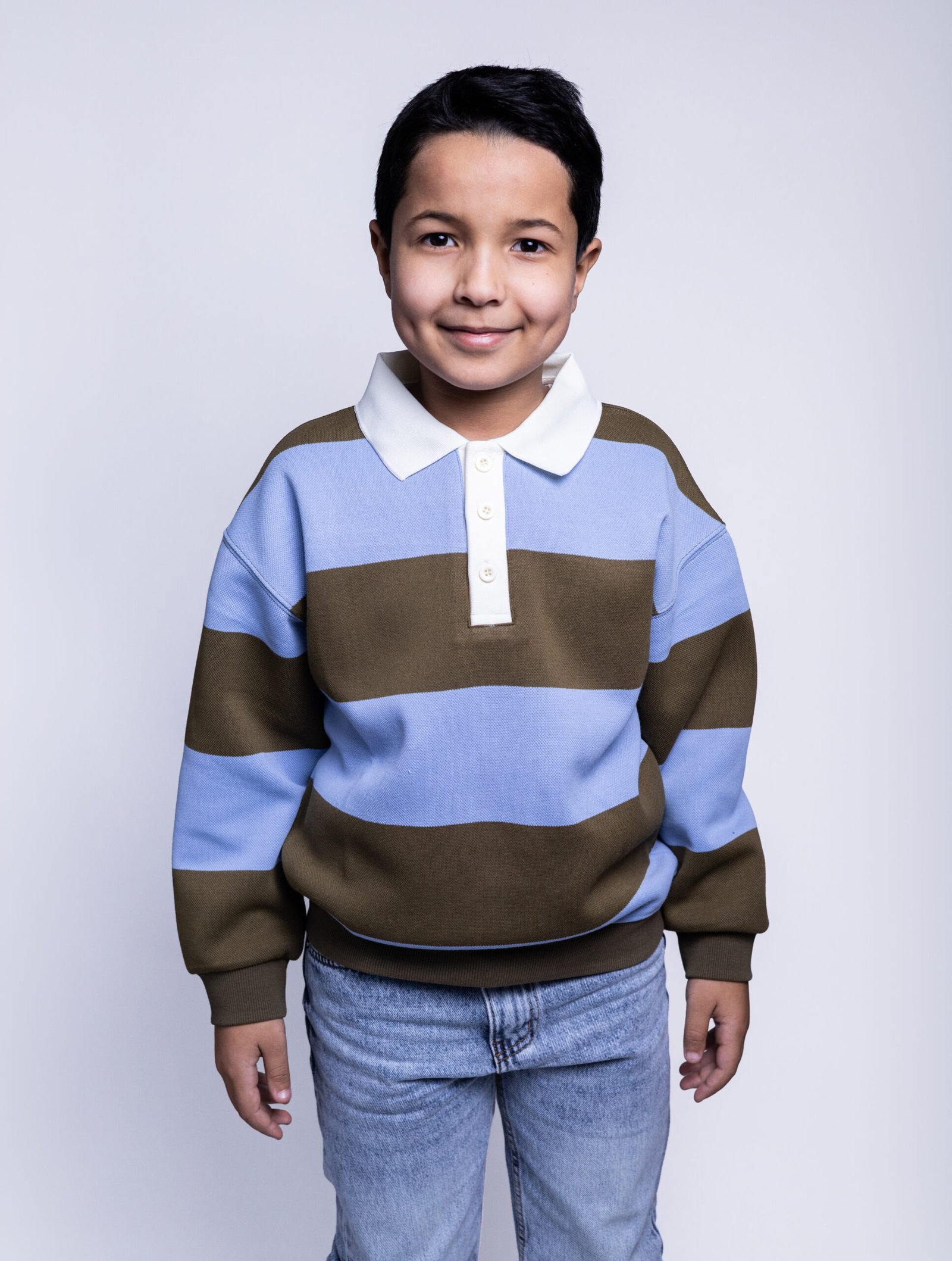 This kids polo sweatshirt blends classic design with everyday comfort. Featuring wide horizontal stripes in soft blue and earthy brown, it offers a balanced, stylish look that feels both modern and timeless.