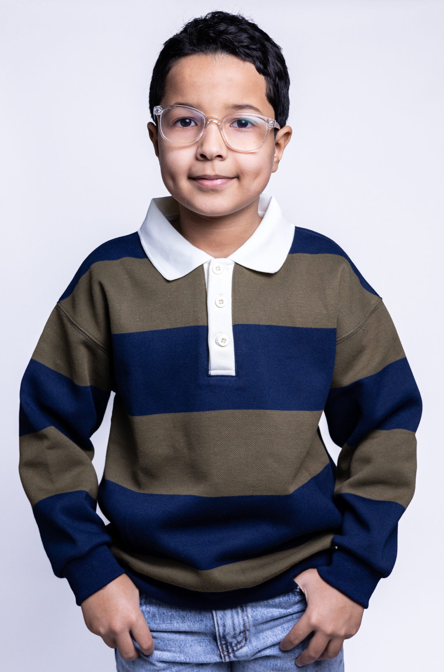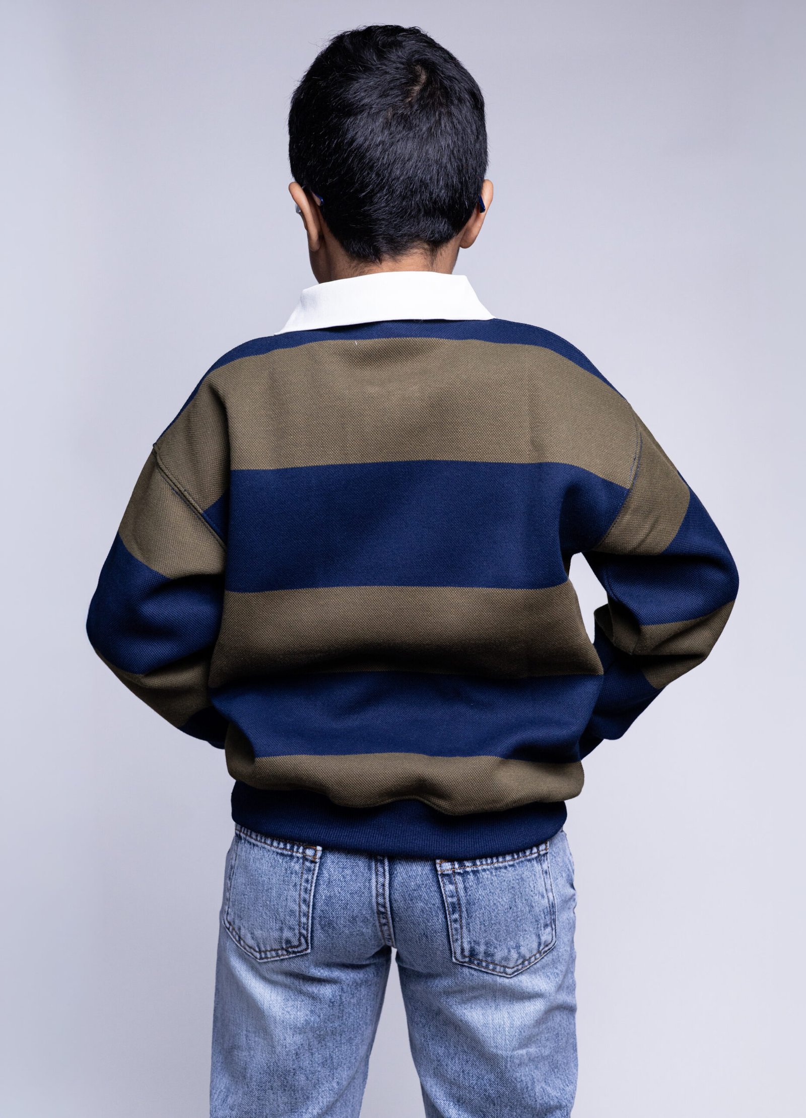 This kids polo sweatshirt blends classic design with everyday comfort. Featuring wide horizontal stripes in soft NAVY and earthy GREEN, it offers a balanced, stylish look that feels both modern and timeless.